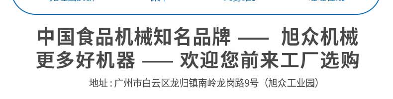 廣州旭眾食品機(jī)械有限公司是一家集科研開發(fā),生產(chǎn)設(shè)計,營銷服務(wù)為一體的現(xiàn)代化生產(chǎn)企業(yè)?,F(xiàn)代化生產(chǎn)車間,精湛制造技術(shù),所產(chǎn)機(jī)械歷經(jīng)市場重重考驗,不斷贏得海內(nèi)外客戶的贊譽(yù)。