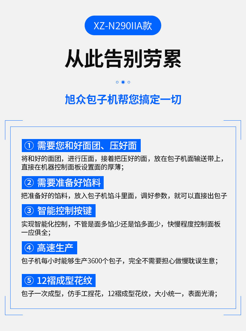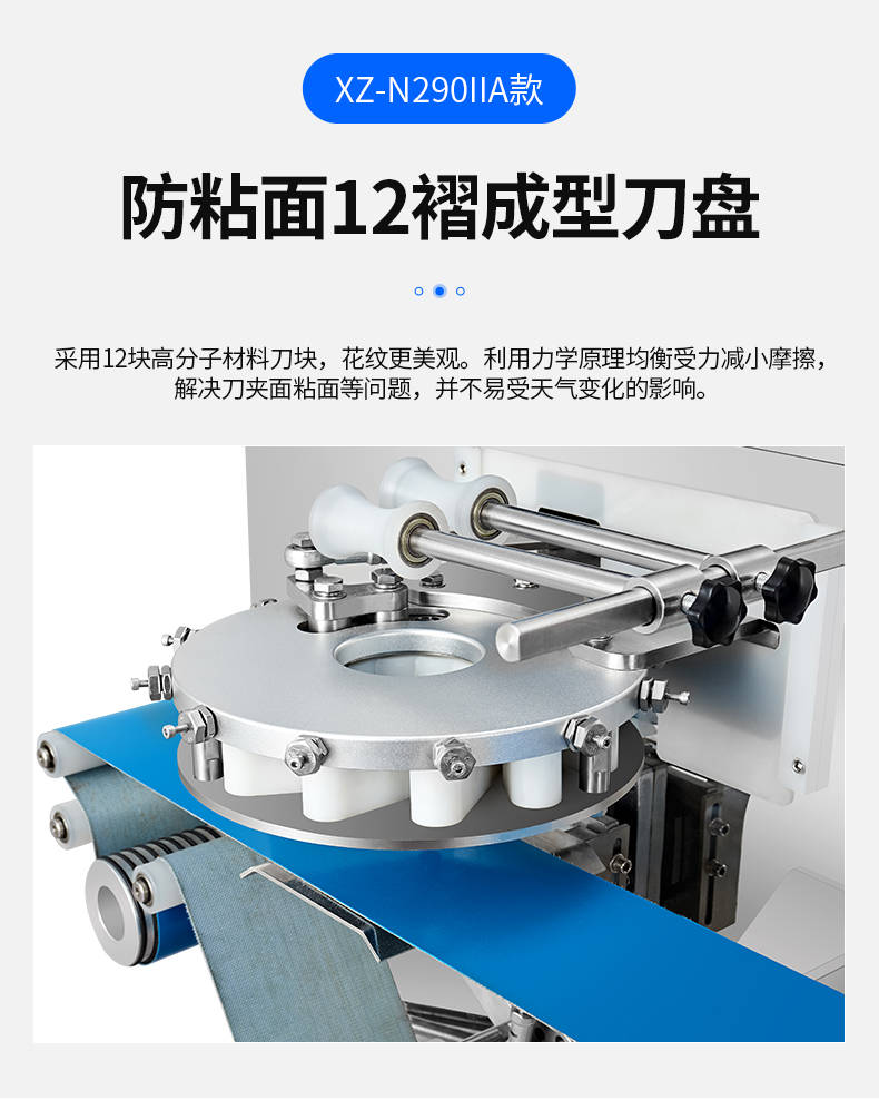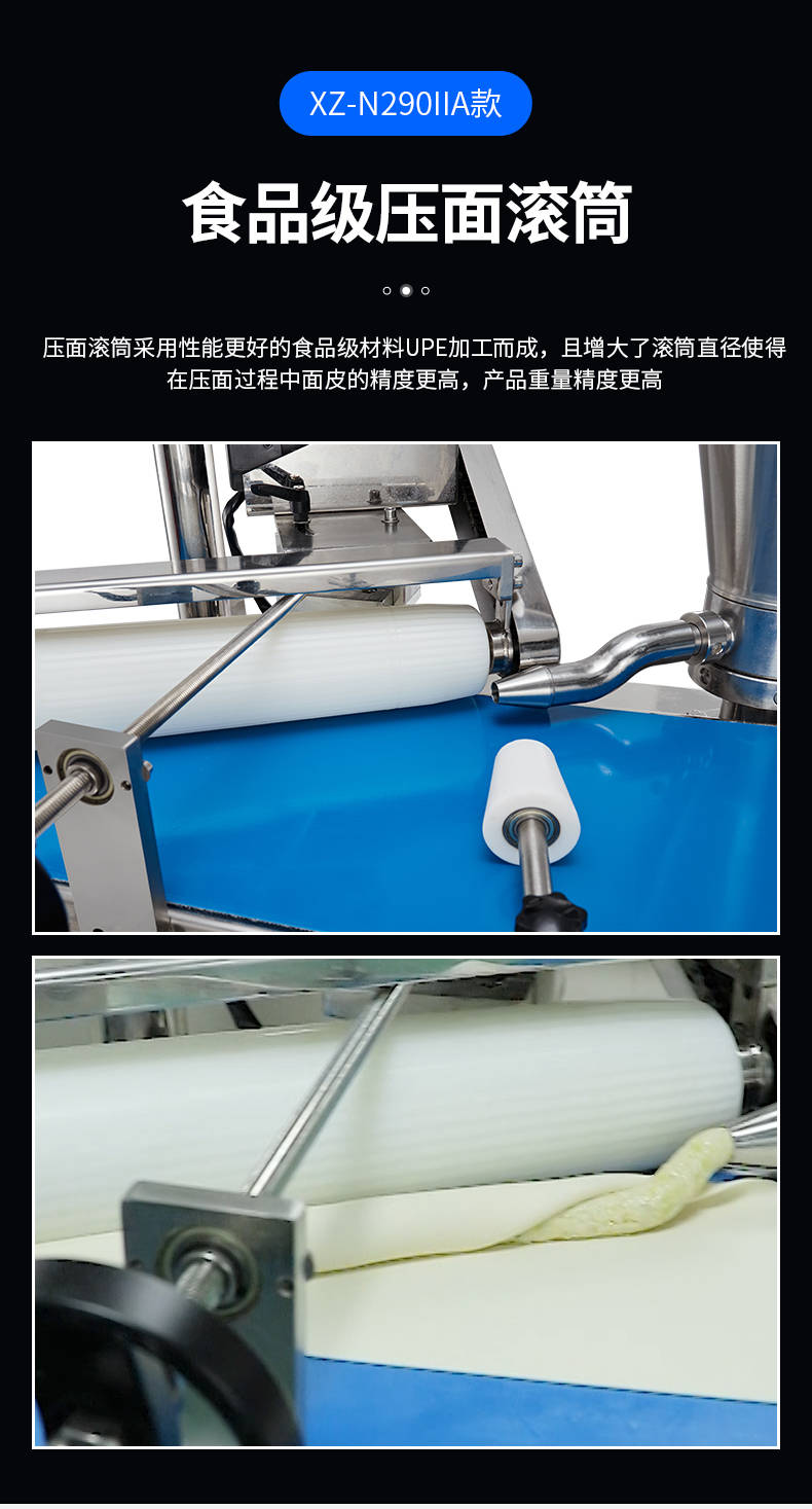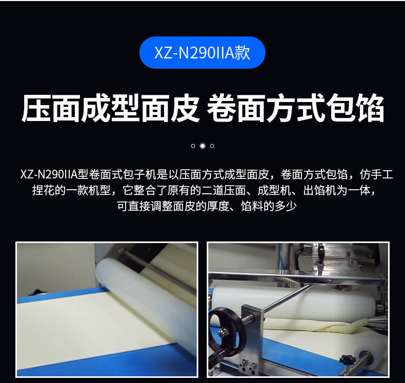 XZ-N290IIA卷面式包子機,壓面成型面皮,卷面方式包餡。仿手工捏花、一次成型、表面光滑、口感勁道。面餡可調(diào)、制品多樣。產(chǎn)品重量精度高,規(guī)格,大小,面皮的厚度皆可調(diào)控。