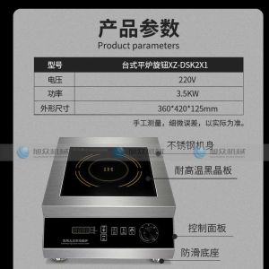 臺式平爐旋鈕XZ-DSK2X1,商用智能電磁爐3500W大火力、節(jié)能省電、聚能加熱。您需要一臺經(jīng)久耐用的好電磁爐不銹鋼材質(zhì)加厚不銹鋼架構,穩(wěn)定耐用,不易生銹,耐腐蝕,易清潔,干凈省事。