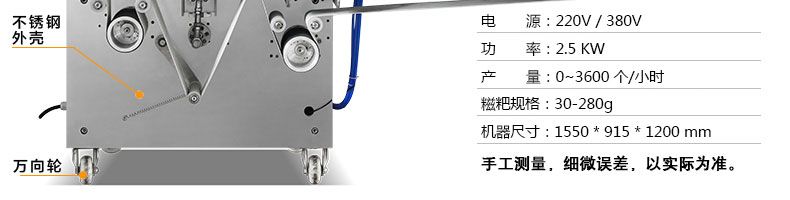 名稱XZ-5000A糍粑機 電源220/380V(見機器名牌) 功率2.5kw 產(chǎn)量0-5200個/小時 尺寸1550*980*1300mm 重量280kg 規(guī)格20-180克/個 其他
