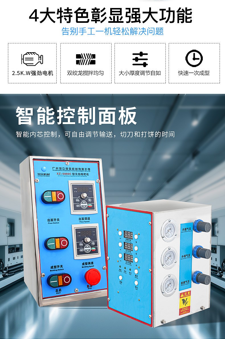 XZ-5000C糍粑機(jī),軟糯細(xì)膩、省時(shí)省力,不銹鋼糍粑機(jī)。智能控制面板,智能內(nèi)芯控制,可自由調(diào)節(jié)輸送,切刀和打餅的時(shí)間。拍扁刀切功能,具備氣缸打餅以及氣缸切刀的功能、又薄又準(zhǔn)確、可制作長(zhǎng)條形的產(chǎn)品。