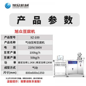 名稱XZ-100型全自動(dòng)豆腐機(jī) 電源220/380V 功率磨漿11KW,煮漿12KW 產(chǎn)量豆?jié){產(chǎn)量100kg/h,豆腐產(chǎn)量50kg/h 尺寸800X600X1350mm 重量150kg 規(guī)格聯(lián)系銷售員 其他