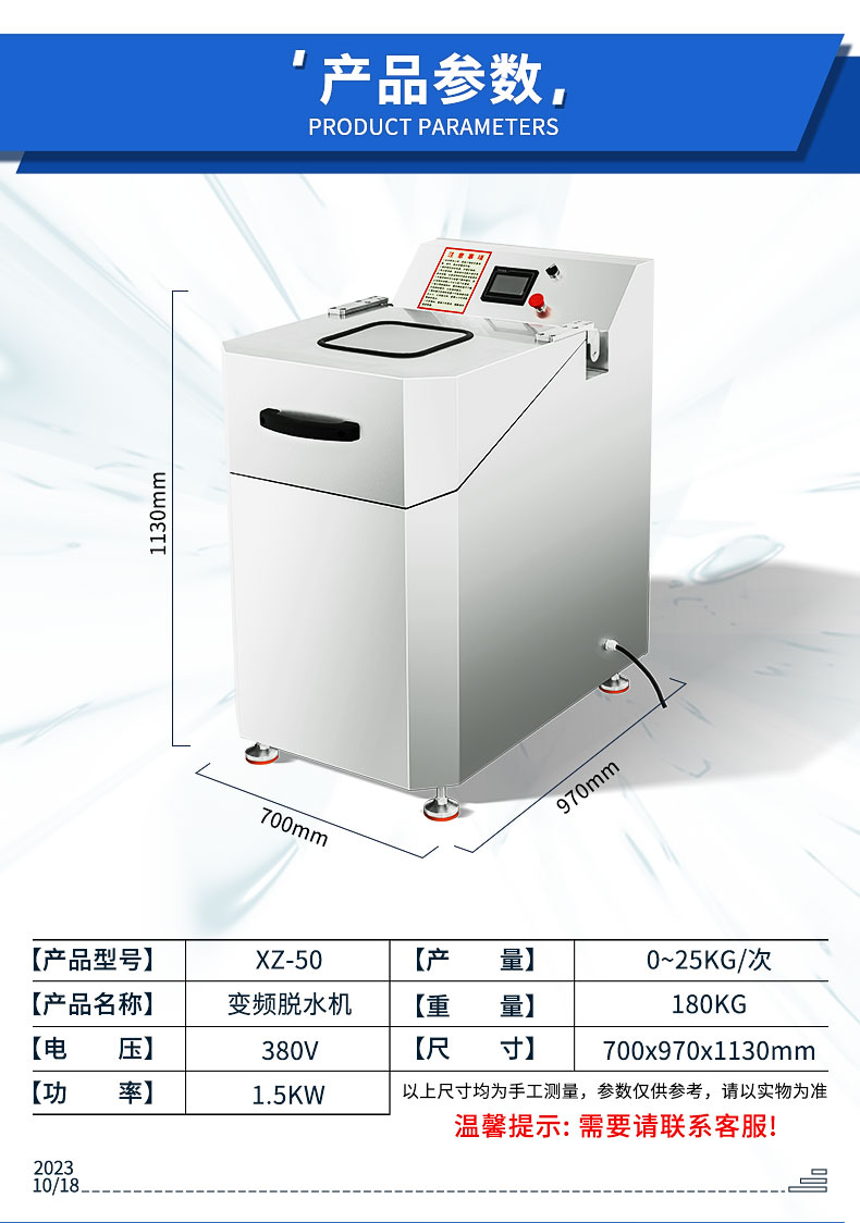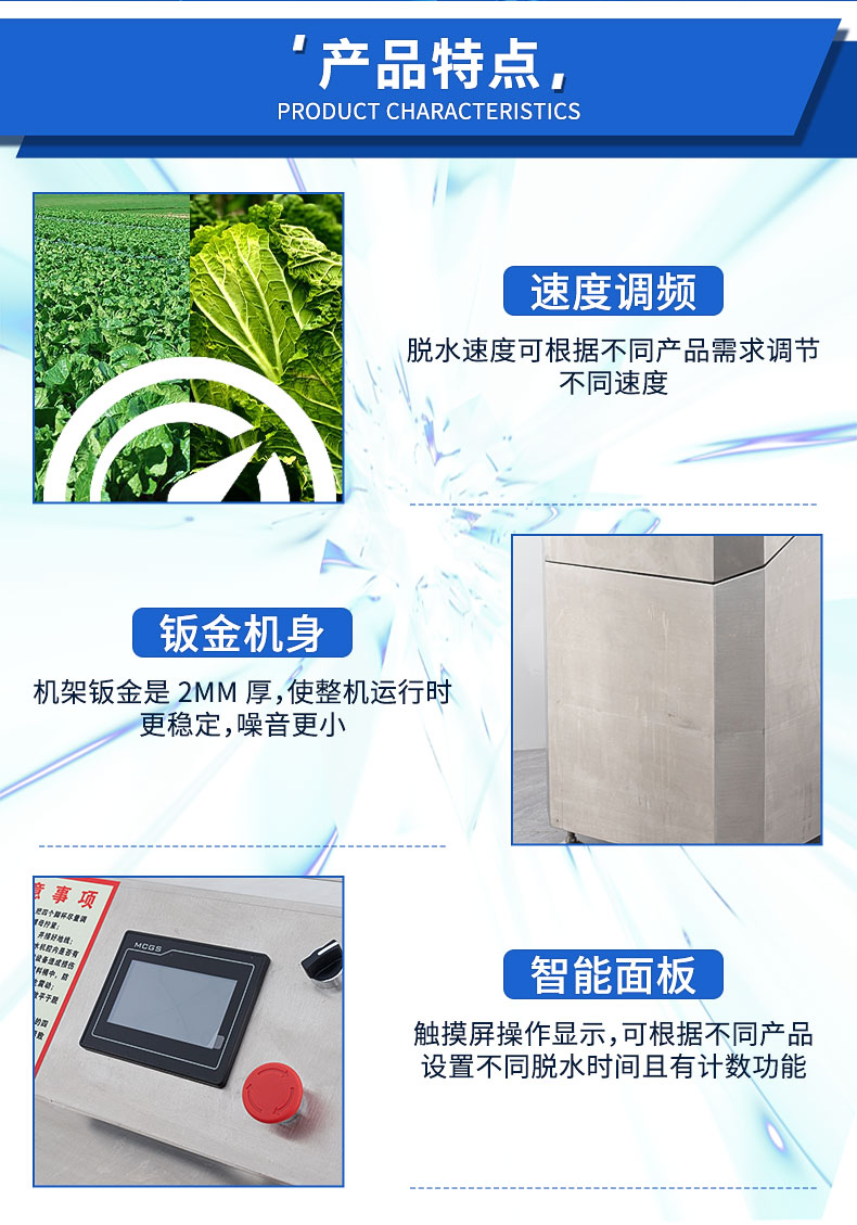 XZ-50型脫水機(jī),蔬菜脫水食品甩干,變頻控制、方便快捷。速度調(diào)頻,脫水速度可根據(jù)不同產(chǎn)品需求調(diào)節(jié)不同速度。鈑金機(jī)身,機(jī)架鈑金是 2MM 厚,使整機(jī)運(yùn)行時更穩(wěn)定,噪音更小。