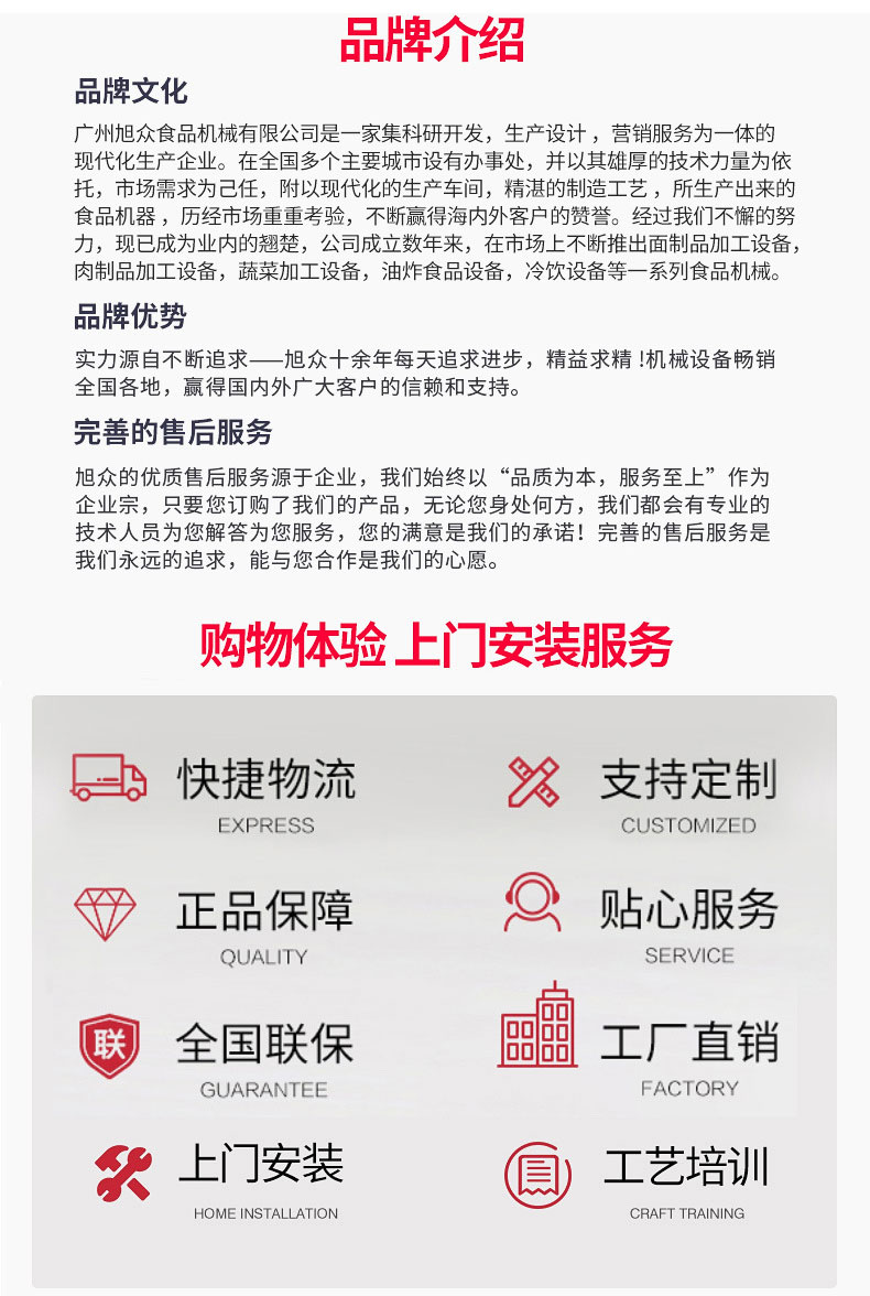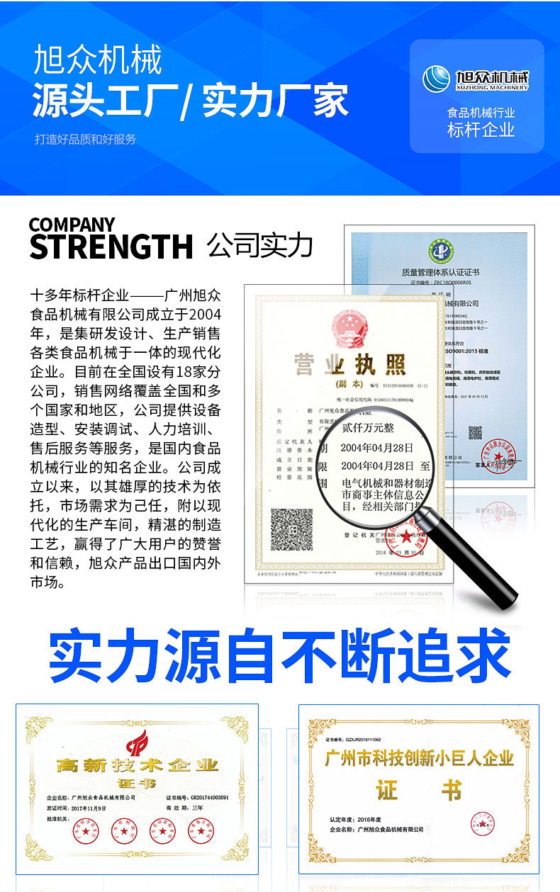 廣州旭眾食品機(jī)械有限公司是一家集科研開發(fā),生產(chǎn)設(shè)計,營銷服務(wù)為一體的現(xiàn)代化生產(chǎn)企業(yè)。現(xiàn)代化生產(chǎn)車間,精湛制造技術(shù),所產(chǎn)機(jī)械歷經(jīng)市場重重考驗(yàn),不斷贏得海內(nèi)外客戶的贊譽(yù)。