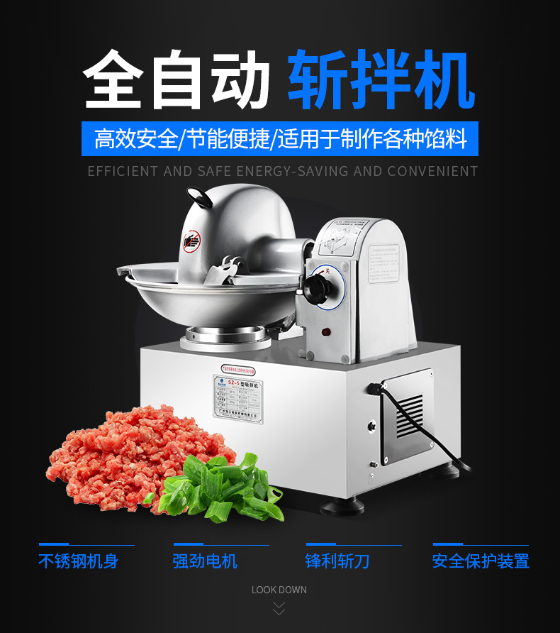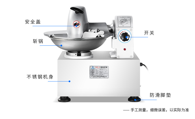 SZ-5型斬拌機(jī),全自動斬拌機(jī),高效安全、節(jié)能便捷、適用于制作各種餡料??蓴匕瓒喾N制品,可制作瓜果,蔬菜,肉類切細(xì)用作餡料。優(yōu)質(zhì)選材打造不銹鋼機(jī)身,機(jī)身穩(wěn)定,經(jīng)久耐用,易于清洗。