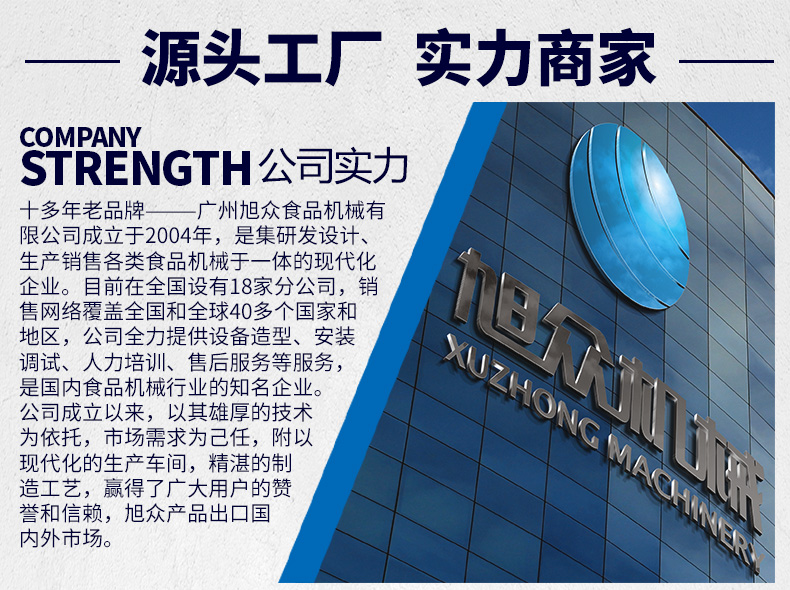廣州旭眾食品機(jī)械有限公司是一家集科研開發(fā),生產(chǎn)設(shè)計,營銷服務(wù)為一體的現(xiàn)代化生產(chǎn)企業(yè)?,F(xiàn)代化生產(chǎn)車間,精湛制造技術(shù),所產(chǎn)機(jī)械歷經(jīng)市場重重考驗,不斷贏得海內(nèi)外客戶的贊譽(yù)。