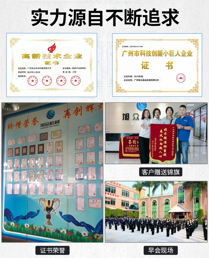 廣州旭眾食品機(jī)械有限公司是一家集科研開發(fā),生產(chǎn)設(shè)計(jì),營(yíng)銷服務(wù)為一體的現(xiàn)代化生產(chǎn)企業(yè)。現(xiàn)代化生產(chǎn)車間,精湛制造技術(shù),所產(chǎn)機(jī)械歷經(jīng)市場(chǎng)重重考驗(yàn),不斷贏得海內(nèi)外客戶的贊譽(yù)。
