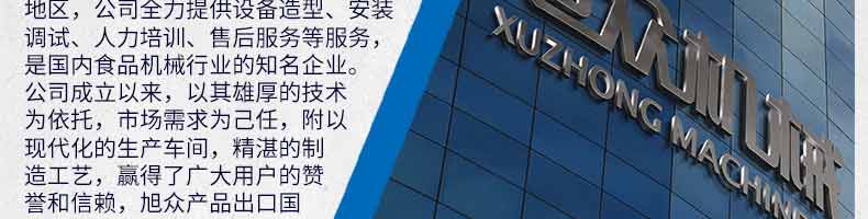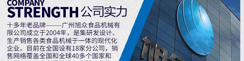 廣州旭眾食品機械有限公司是一家集科研開發(fā),生產(chǎn)設(shè)計,營銷服務為一體的現(xiàn)代化生產(chǎn)企業(yè)?,F(xiàn)代化生產(chǎn)車間,精湛制造技術(shù),所產(chǎn)機械歷經(jīng)市場重重考驗,不斷贏得海內(nèi)外客戶的贊譽。