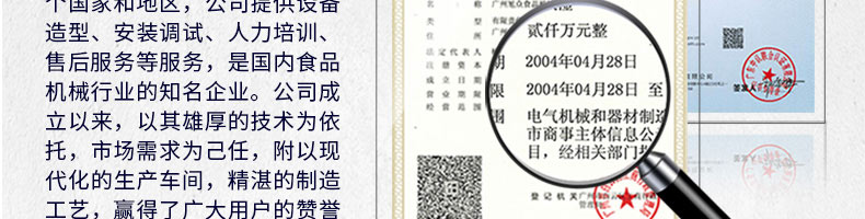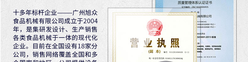 廣州旭眾食品機(jī)械有限公司是一家集科研開(kāi)發(fā),生產(chǎn)設(shè)計(jì),營(yíng)銷服務(wù)為一體的現(xiàn)代化生產(chǎn)企業(yè)?,F(xiàn)代化生產(chǎn)車間,精湛制造技術(shù),所產(chǎn)機(jī)械歷經(jīng)市場(chǎng)重重考驗(yàn),不斷贏得海內(nèi)外客戶的贊譽(yù)。