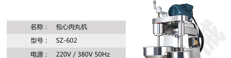 名稱SZ-602包心肉丸機(jī) 電源220/380V(見機(jī)器銘牌) 功率1.1kw 產(chǎn)量140-420個/分鐘 尺寸770*530*1280mm 重量200kg 規(guī)格 其他