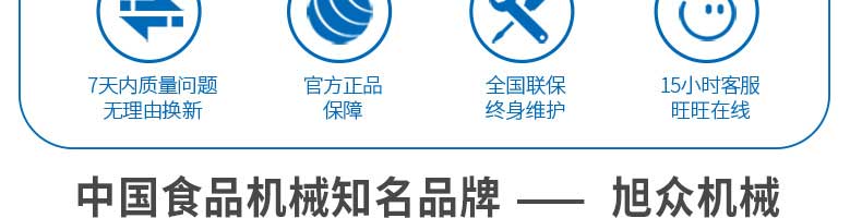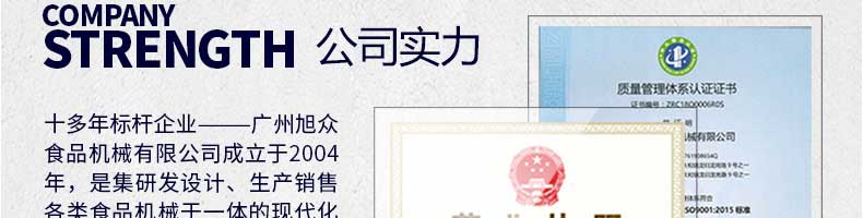 廣州旭眾食品機(jī)械有限公司是一家集科研開發(fā),生產(chǎn)設(shè)計(jì),營銷服務(wù)為一體的現(xiàn)代化生產(chǎn)企業(yè)。現(xiàn)代化生產(chǎn)車間,精湛制造技術(shù),所產(chǎn)機(jī)械歷經(jīng)市場重重考驗(yàn),不斷贏得海內(nèi)外客戶的贊譽(yù)。