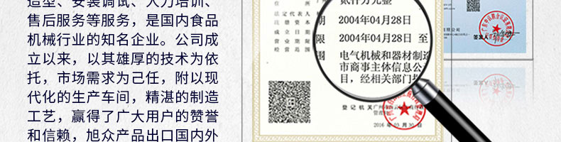廣州旭眾食品機(jī)械有限公司是一家集科研開發(fā),生產(chǎn)設(shè)計(jì),營(yíng)銷服務(wù)為一體的現(xiàn)代化生產(chǎn)企業(yè)?,F(xiàn)代化生產(chǎn)車間,精湛制造技術(shù),所產(chǎn)機(jī)械歷經(jīng)市場(chǎng)重重考驗(yàn),不斷贏得海內(nèi)外客戶的贊譽(yù)。