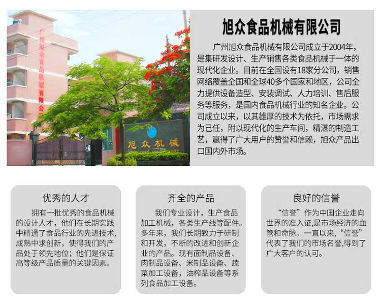廣州旭眾食品機(jī)械有限公司是一家集科研開(kāi)發(fā),生產(chǎn)設(shè)計(jì),營(yíng)銷(xiāo)服務(wù)為一體的現(xiàn)代化生產(chǎn)企業(yè)?,F(xiàn)代化生產(chǎn)車(chē)間,精湛制造技術(shù),所產(chǎn)機(jī)械歷經(jīng)市場(chǎng)重重考驗(yàn),不斷贏得海內(nèi)外客戶(hù)的贊譽(yù)。