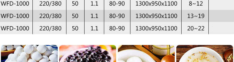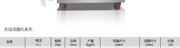 名稱(chēng)VFD-1000無(wú)餡湯圓機(jī) 電源220/380V(見(jiàn)機(jī)器名牌) 功率1.1kw 產(chǎn)量20-50kg/h(規(guī)格不同,產(chǎn)量不同) 尺寸外形尺寸1300*950*1100mm 重量 規(guī)格8-34mm 其他