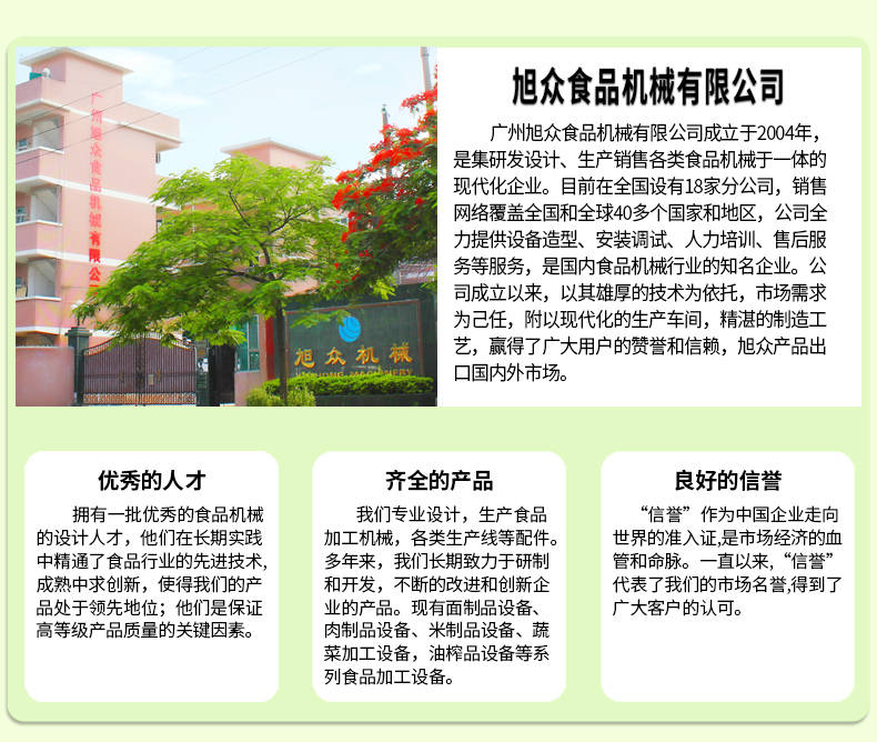 廣州旭眾食品機(jī)械有限公司是一家集科研開(kāi)發(fā),生產(chǎn)設(shè)計(jì),營(yíng)銷(xiāo)服務(wù)為一體的現(xiàn)代化生產(chǎn)企業(yè)。現(xiàn)代化生產(chǎn)車(chē)間,精湛制造技術(shù),所產(chǎn)機(jī)械歷經(jīng)市場(chǎng)重重考驗(yàn),不斷贏得海內(nèi)外客戶的贊譽(yù)。