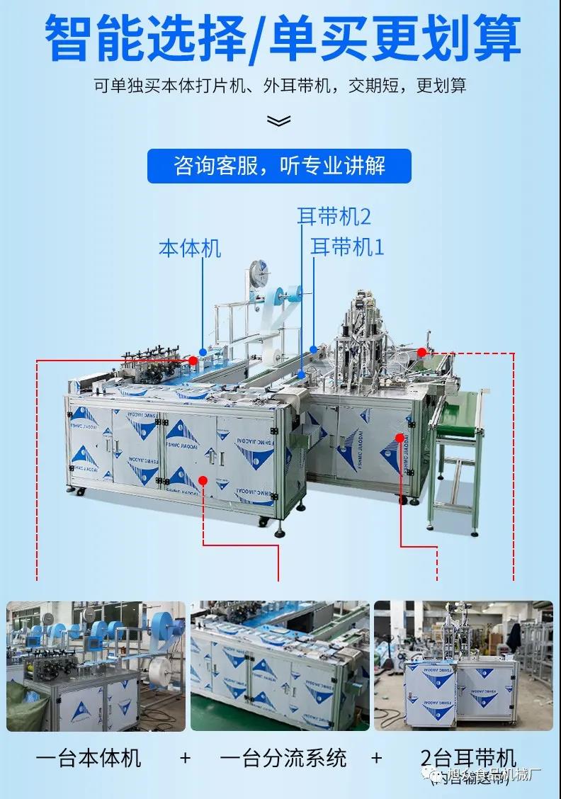 旭眾牌一拖二口罩機由一臺本體機帶動兩臺耳帶機組成。本體機輸出ロ罩本體后,由輸送帶結(jié)構(gòu)將口罩本體片輸送到連接耳帶機的輸送帶上,再通過輸送帶將口罩片輸送到耳帶機的正面第一個口罩盤上方,最后通過氣缸下壓把口罩片放置到耳帶機的口罩盤內(nèi),后續(xù)由耳帶機完成口罩的耳帶熔接,包邊等動作,從而完成一個耳帶口罩產(chǎn)品的生產(chǎn)。本機采用PLC、觸摸屏控制、主傳送帶采用單相馬達(dá)輸送、步進馬達(dá)翻轉(zhuǎn),傳動精確,控制穩(wěn)定,速度可調(diào)。