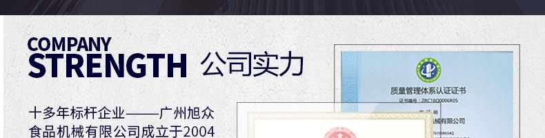 廣州旭眾食品機(jī)械有限公司是一家集科研開(kāi)發(fā),生產(chǎn)設(shè)計(jì),營(yíng)銷服務(wù)為一體的現(xiàn)代化生產(chǎn)企業(yè)?,F(xiàn)代化生產(chǎn)車間,精湛制造技術(shù),所產(chǎn)機(jī)械歷經(jīng)市場(chǎng)重重考驗(yàn),不斷贏得海內(nèi)外客戶的贊譽(yù)。