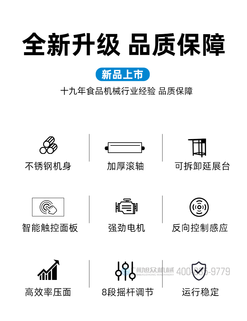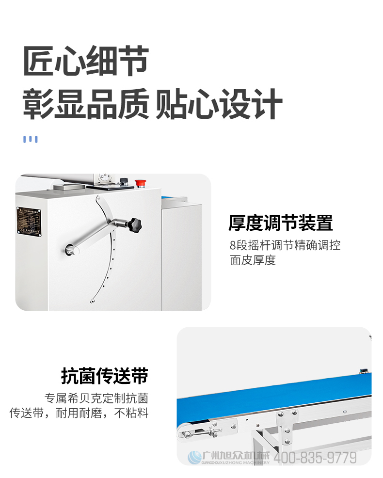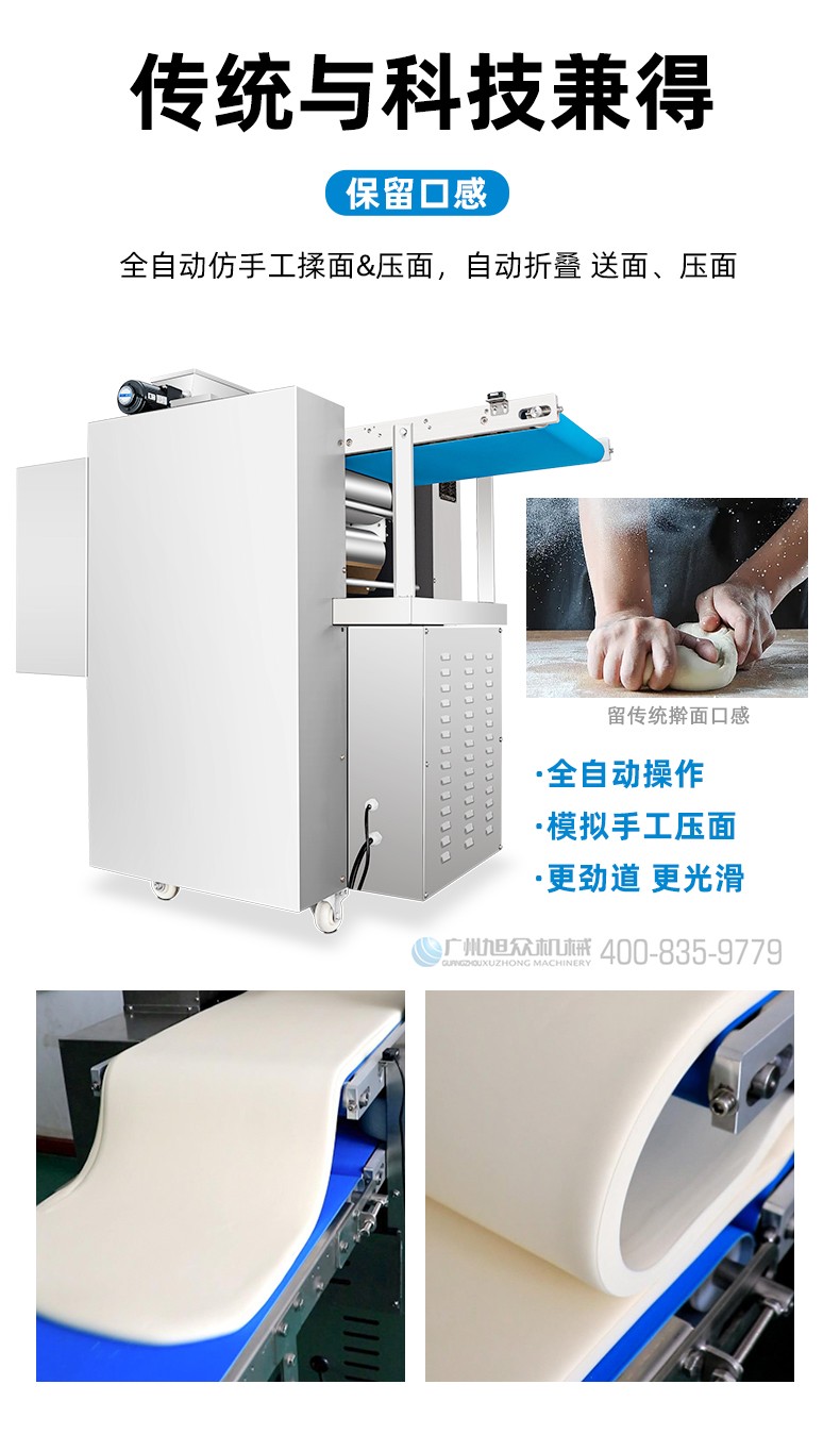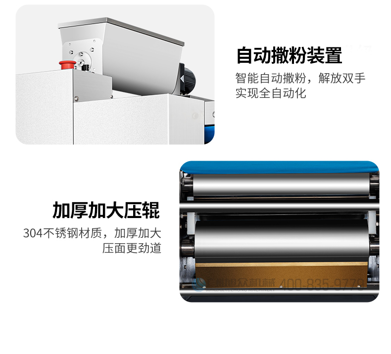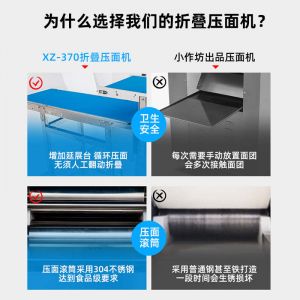 XZ-ZDYMJ370型自動折疊壓面機,整機不銹鋼機身打造,真材實料,選用不銹鋼材質(zhì),打造經(jīng)久耐用、防腐蝕。匠心細節(jié),彰顯品質(zhì)貼心設(shè)計。一鍵設(shè)定壓面次數(shù),智能定時,只需設(shè)定好壓面次數(shù),就能全自動壓面出面。