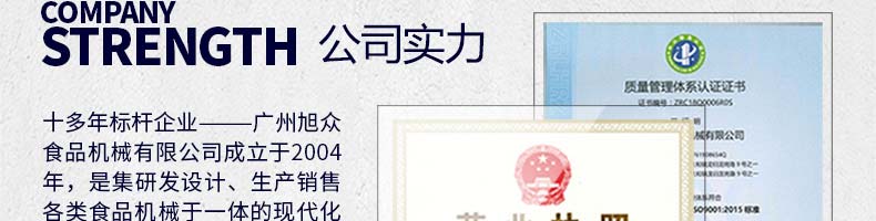 廣州旭眾食品機械有限公司是一家集科研開發(fā),生產(chǎn)設(shè)計,營銷服務(wù)為一體的現(xiàn)代化生產(chǎn)企業(yè)?,F(xiàn)代化生產(chǎn)車間,精湛制造技術(shù),所產(chǎn)機械歷經(jīng)市場重重考驗,不斷贏得海內(nèi)外客戶的贊譽。