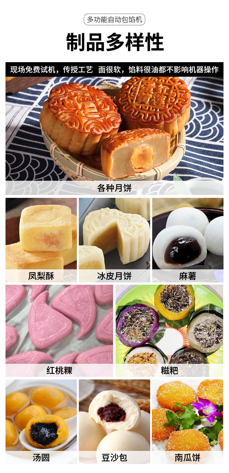 SZ-69型多功能自動包餡機(jī),餡斗/面斗,可整個拆卸清洗,增加了自動拔料功能。月餅鳳梨酥紅桃裸湯圓南瓜餅軟餡餅。在嚴(yán)把質(zhì)量關(guān)的同時,產(chǎn)品的關(guān)鍵部件都選自國內(nèi)優(yōu)秀企業(yè)。只有不斷的提高產(chǎn)品的質(zhì)量,才能使客戶從中獲益,而客戶的成功最終也就是我們的成功。