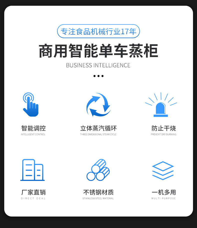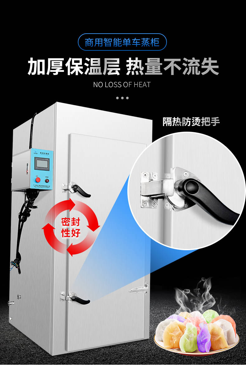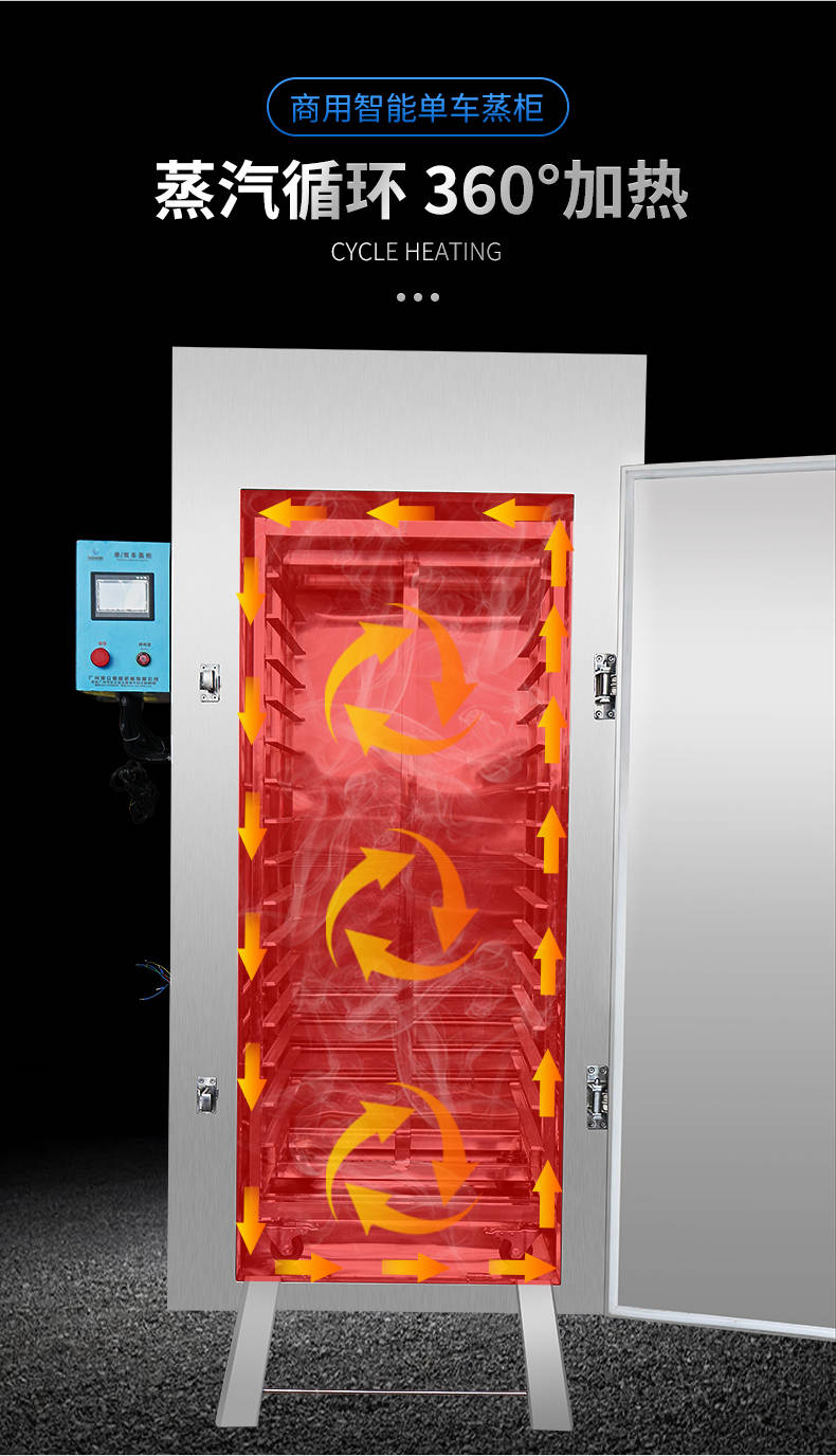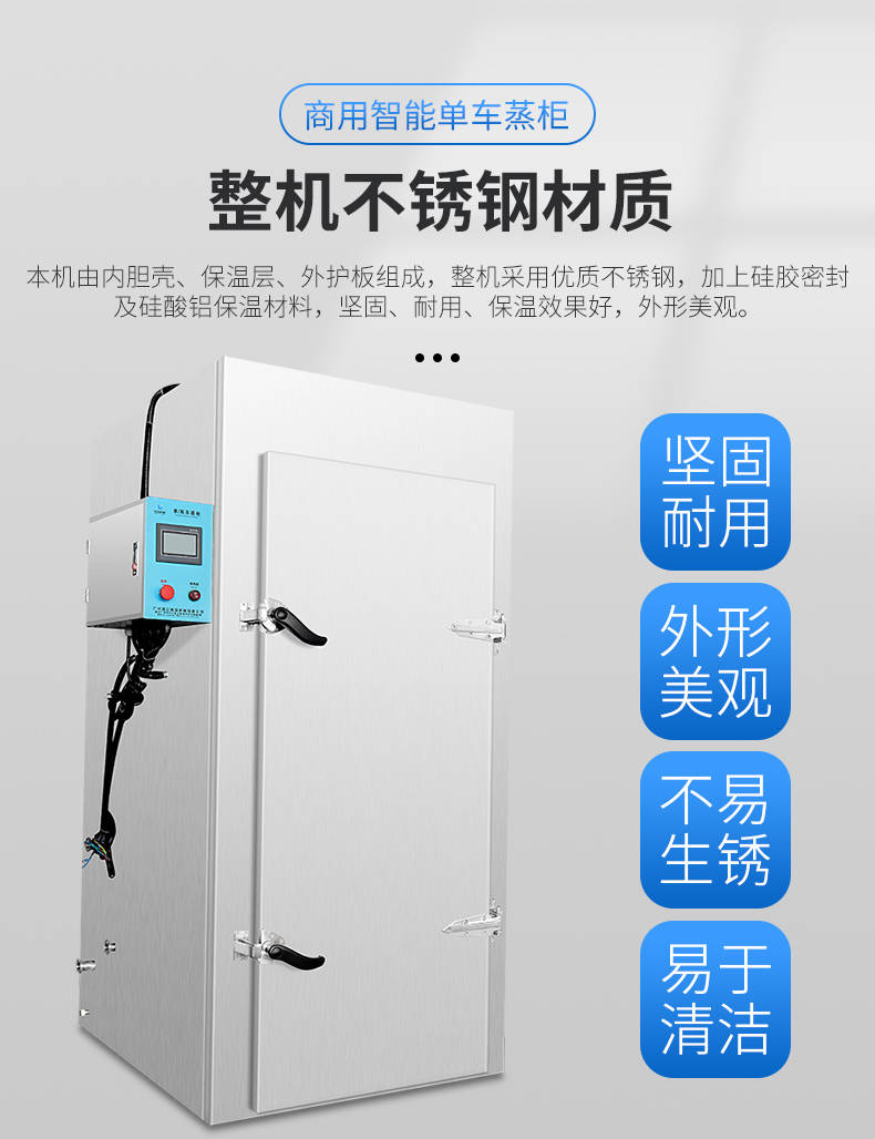 單車蒸柜,整機不銹鋼材質(zhì)本機由內(nèi)膽殼、保溫層、外護板組成,整機采用優(yōu)質(zhì)不銹鋼,加上硅膠密封及硅酸鋁保溫材料,堅固、耐用、保溫效果好,外形美觀。循環(huán)均勻發(fā)熱,專門用于發(fā)熱管干燒空氣,溫度任意調(diào)節(jié),讓食物口感怡到好吃